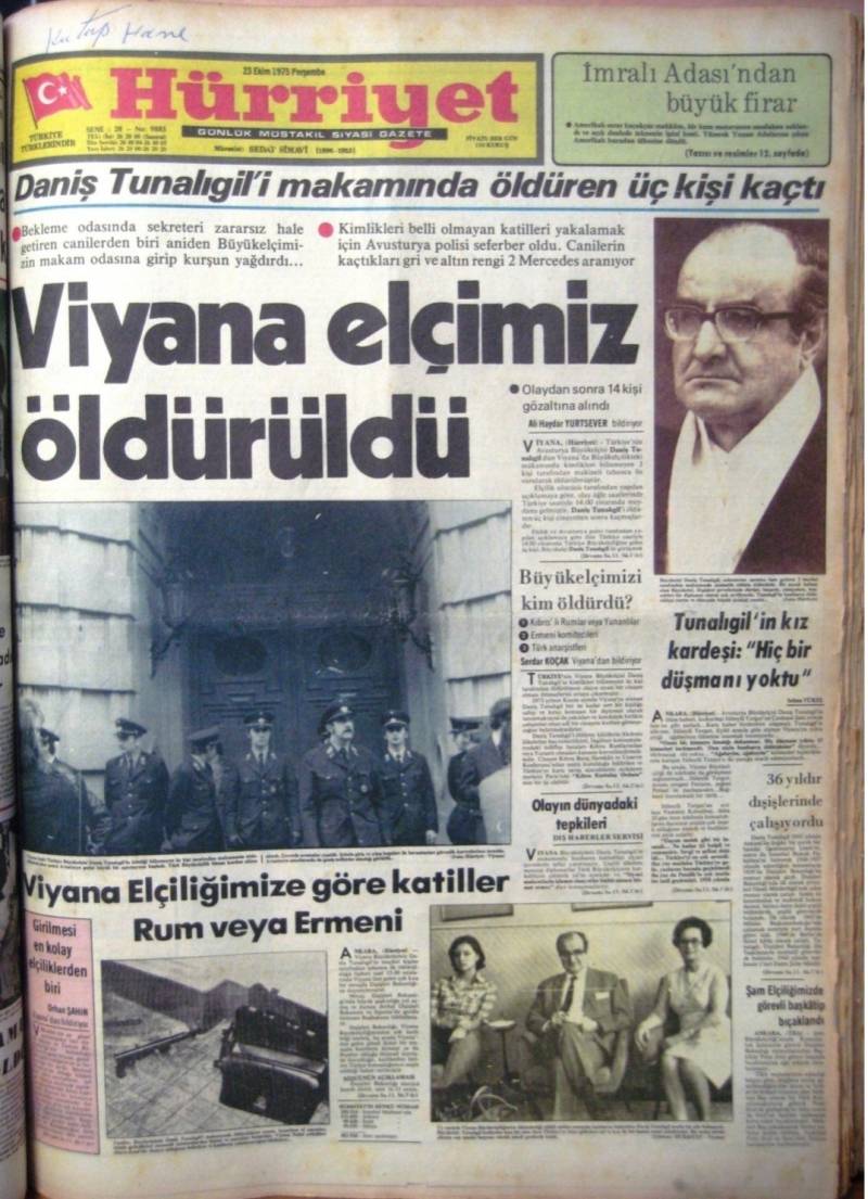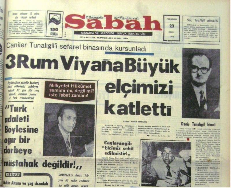Türkiye'nin Viyana Büyükelçisi Daniş Tunalıgil22 Ekim 1975 günü makam odasında üç kişi tarafından otomatik silahlarla öldürüldü. Saldırıyı Ermeni terör örgütleri ASALA ve JCAG-ARA ile Rum terör örgütü EOKA-B üstlendi. O sıralarda Ermenilerin bu şekilde cinayet işleyemeyeceğini düşünen Viyana polisi cinayetin zanlısı olarak üç Yunanlıyı aramaya başladı. Viyana suikastından 2 gün sonra 24 Ekim 1975'te Türkiye'nin Paris Büyükelçisi İsmail Erez ve şoförü Talip Yener de yine otomatik silahlı üç kişi tarafından öldürüldüler. Viyana ve Paris polisinin bütün aramalarına rağmen Tunalıgil ve Erez'in katilleri bulunamadı. Ermenilerin o yıllarda böyle bir suikastı düzenleyemeyeceği düşünüldüğünden, Tunalıgil ve Erez suikastlarının katilleri yanlış yerlerde arandı. Türkiye ile Yunanistan arasının çok kötü olması katillerin Rumlar olduğuna dair iddiaları gündeme taşıdı. Viyana polisi çok geçmeden Tunalıgil'in öldürülmesiyle ilgili dosyayı kapattı.