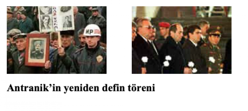 Ölürken cesedinin “vatan topraklarına” gömülmesini istemişti. Vatan toprağı diye tarif edilen ve gelecek Ermeni nesillerine hedef gösterilen şüphesiz ki Doğu Anadolu toprakları idi. Erivan’da Antranik için yapılan törenlerde dile getirilen “mezarın nakli tarihi bir hadisedir” sözleri de aslında onlara göre, Antranik’in vasiyetinin yerine getirilmesi zamanının yaklaştığı şeklinde yorumlanabilir.