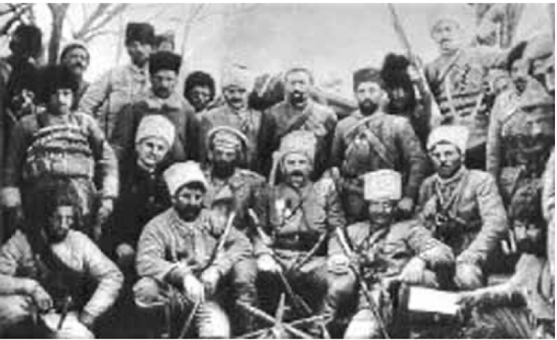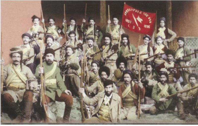 1890-1896 yılları arasında Osmanlı üleşinin bütün bölgelerinde kanlı olaylar çıkaran, binlece masum insanın ölmesine sebep olan Taşnak çetelerinden bir grup flamaları altında.