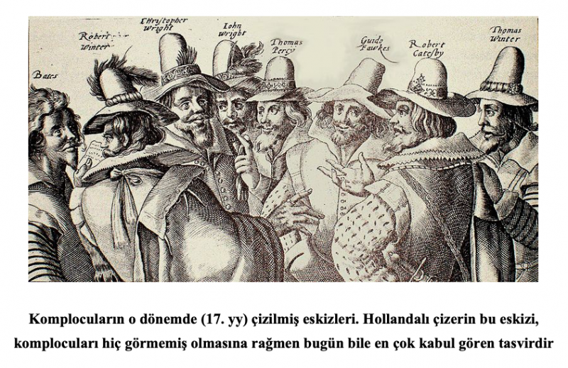 Komplocuların o dönemde (17. yy) çizilmiş eskizleri. Hollandalı çizerin bu eskizi, komplocuları hiç görmemiş olmasına rağmen bugün bile en çok kabul gören tasvirdir
