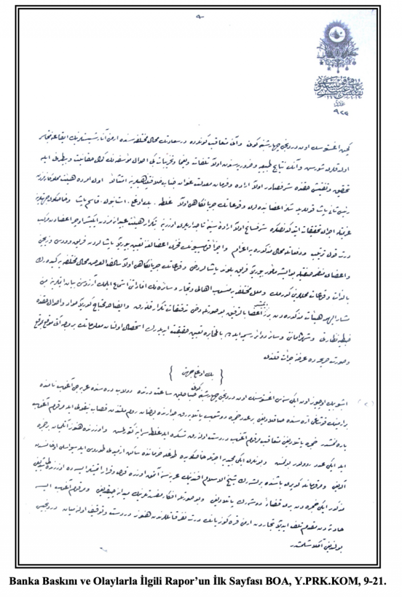 Banka Baskını ve Olaylarla İlgili Rapor’un İlk Sayfası BOA, Y.PRK.KOM, 9-21.